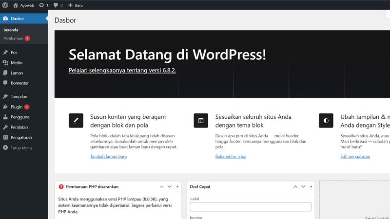 Itu tadi menu dashboard admin default sebelum ditambahkan plugin untuk memodifikasi tampilan website, selanjutnya kita akan membahas mengenai plugin.